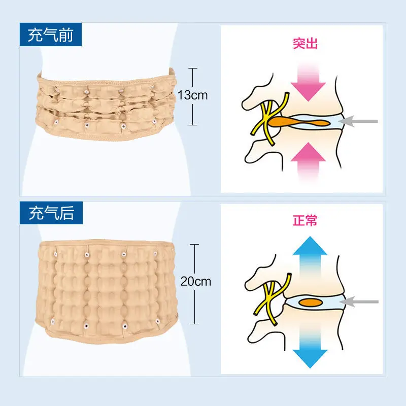 Use direction: Wearing the belt against the skin directly or on loose fitting clothing,Wearing the belt between the lower rib cage and hip, attaching the belt firmly,Clip pump onto the gas valve of the belt, and then inflate the belt by pumping the pump,The most effective traction effect is obtained when the air pillars of belt are fully inflated